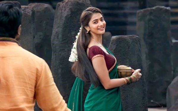 Pooja Hegde mesmerised us with the portrayal of Prerana in Radhe Shyam and Preeti in Beast while also flooring us with her vintage and glamorous avatars in both the films. She is now set to impress upon her versatility in the role of a village belle, Neelambari in Acharya, that is slated to release on April 29, 2022. Dropping her glam avatar, Pooja is seen in an enchanting green lehenga saree with minimal to no makeup and her hair done with mogra flowers.