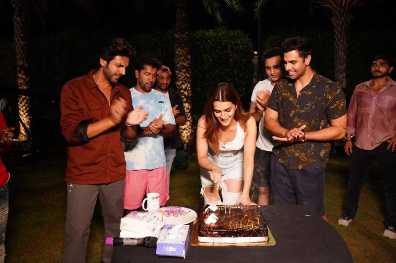 From director, Rohit Dhawan to her co-star, Kartik Aaryan the team could all be seen celebrating with her as they clap while Kriti cut the cake, rocking a white top and ripped jeans.